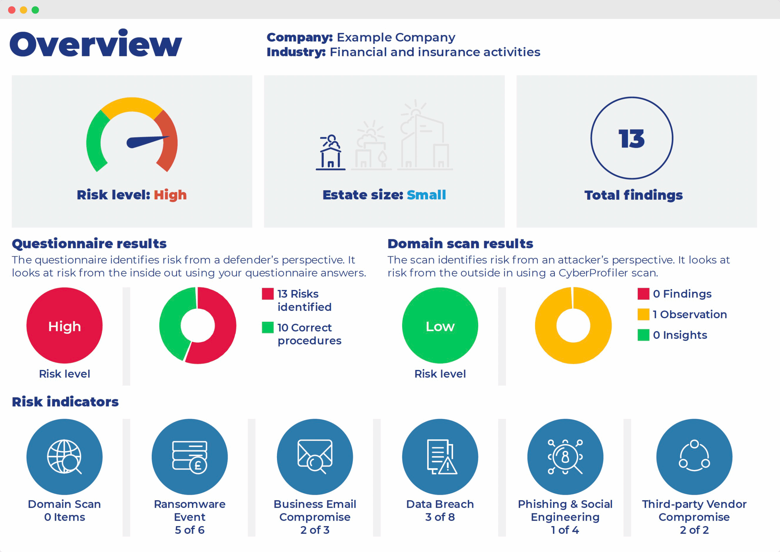 View your security results in a comprehensive dashboard. This dashboard provides an overview of your organisation’s exposure to the leading and most likely cyber incidents.